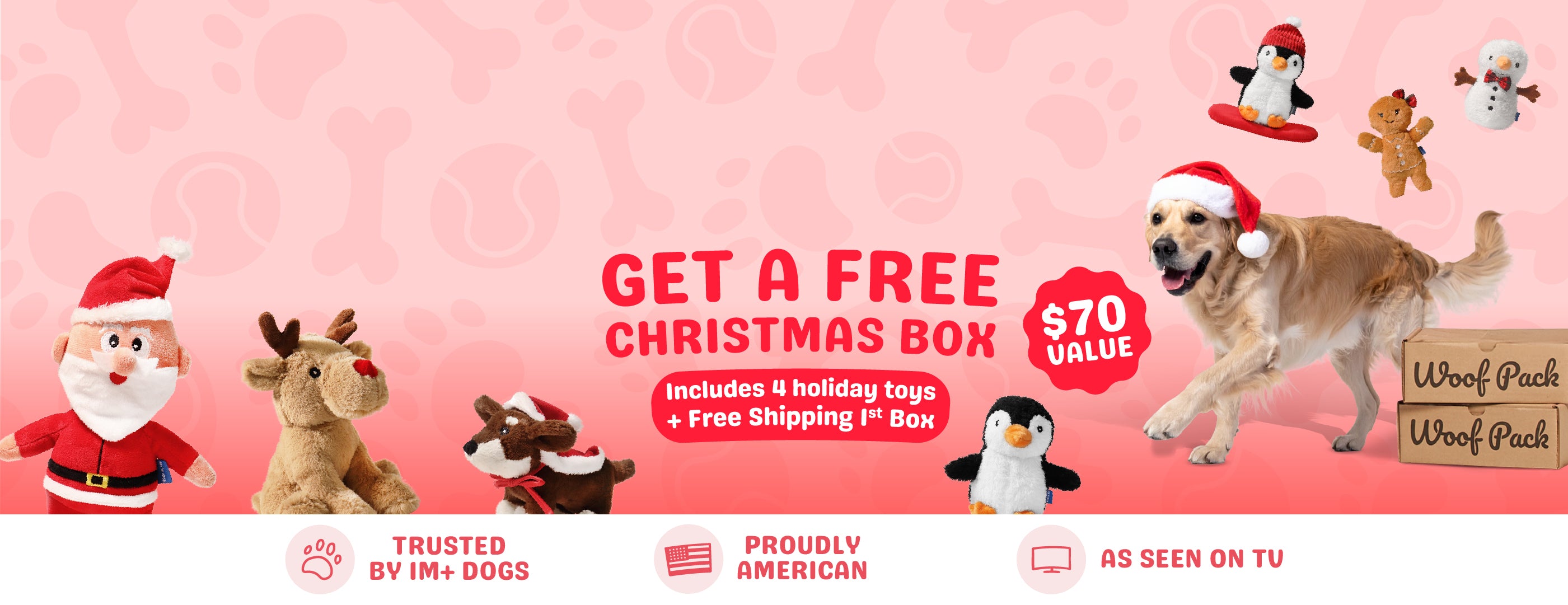 Woof Pack is America’s favorite dog subscription box, delivering the perfect mix of all-natural Canadian/American made treats and unique toys tested by real dogs. Every product meets strict American standards, so you can trust what goes into your pup’s box each month.