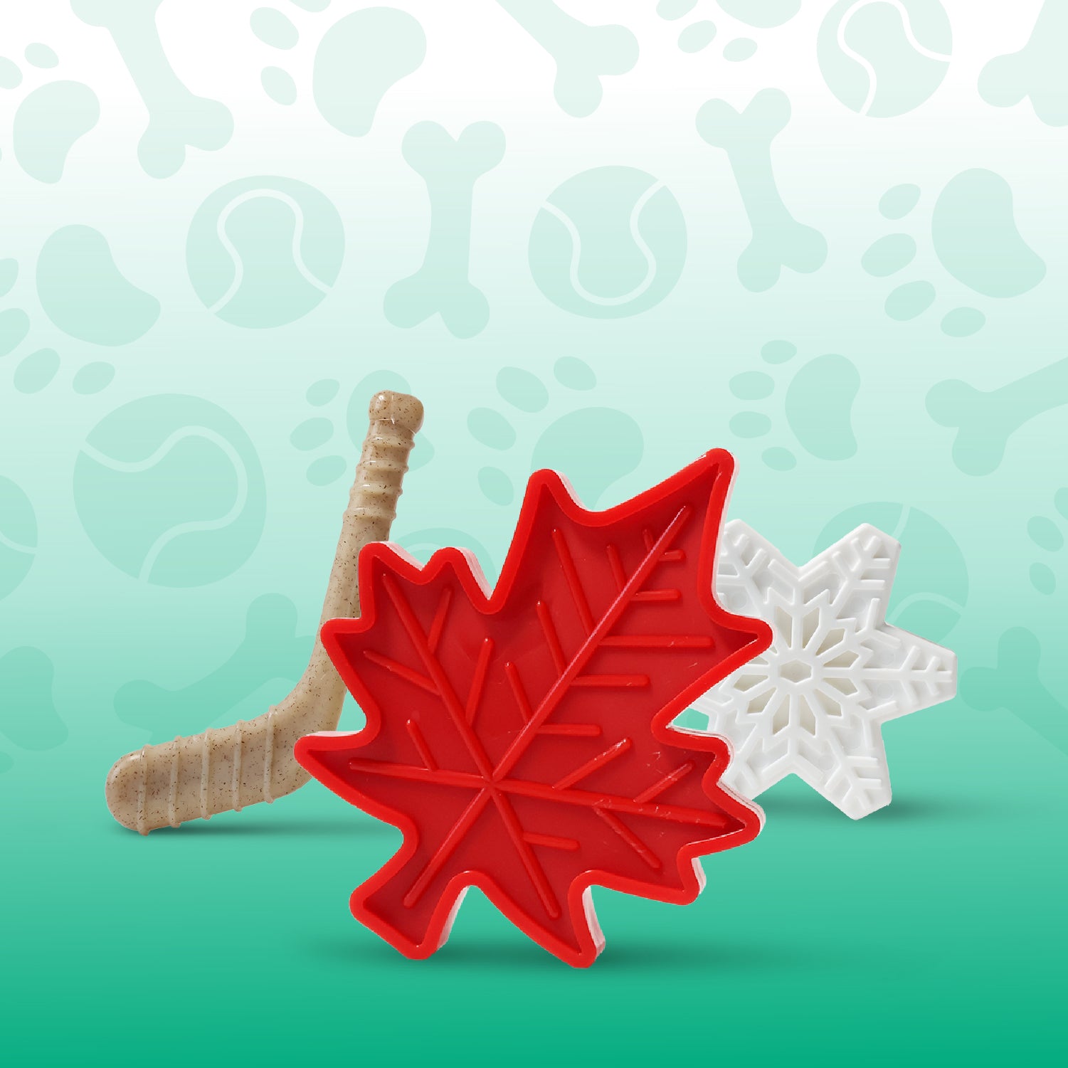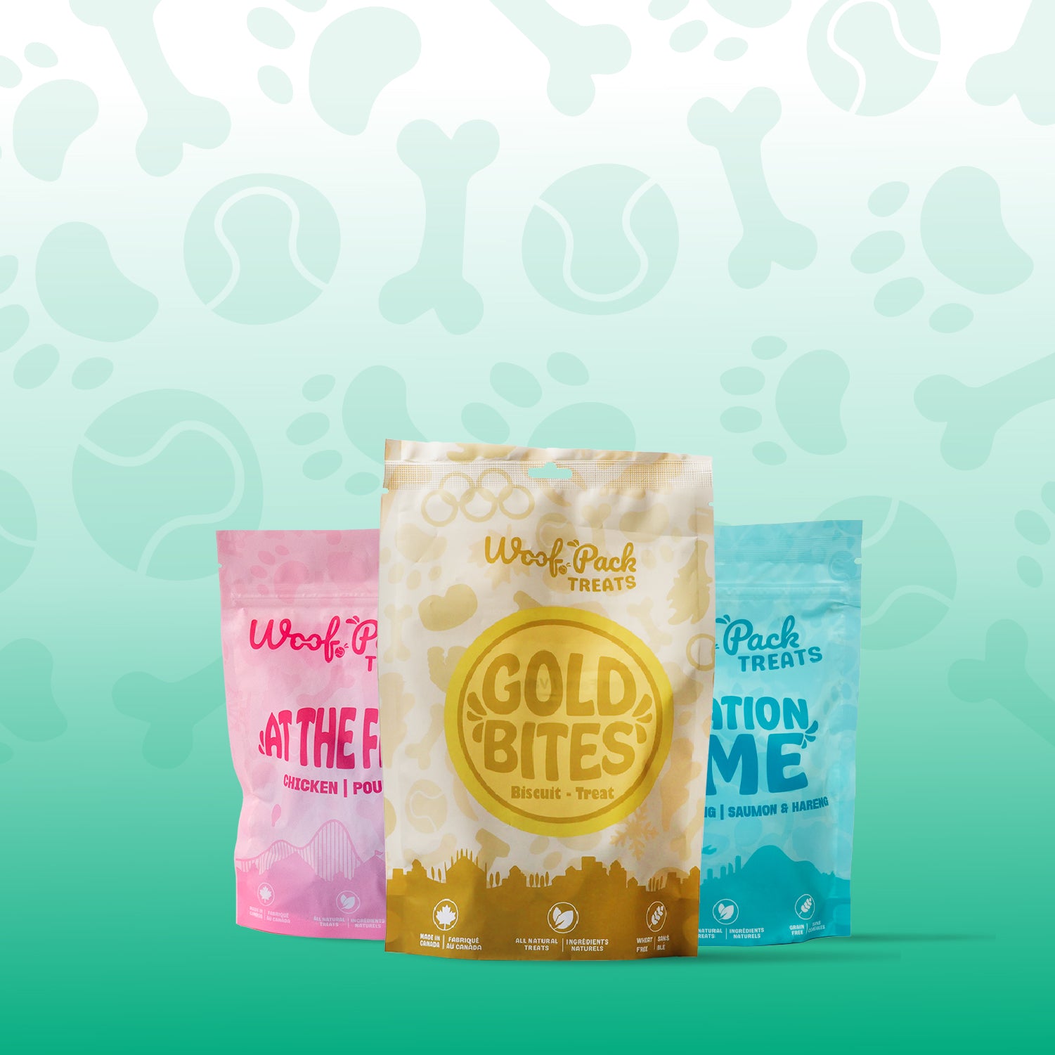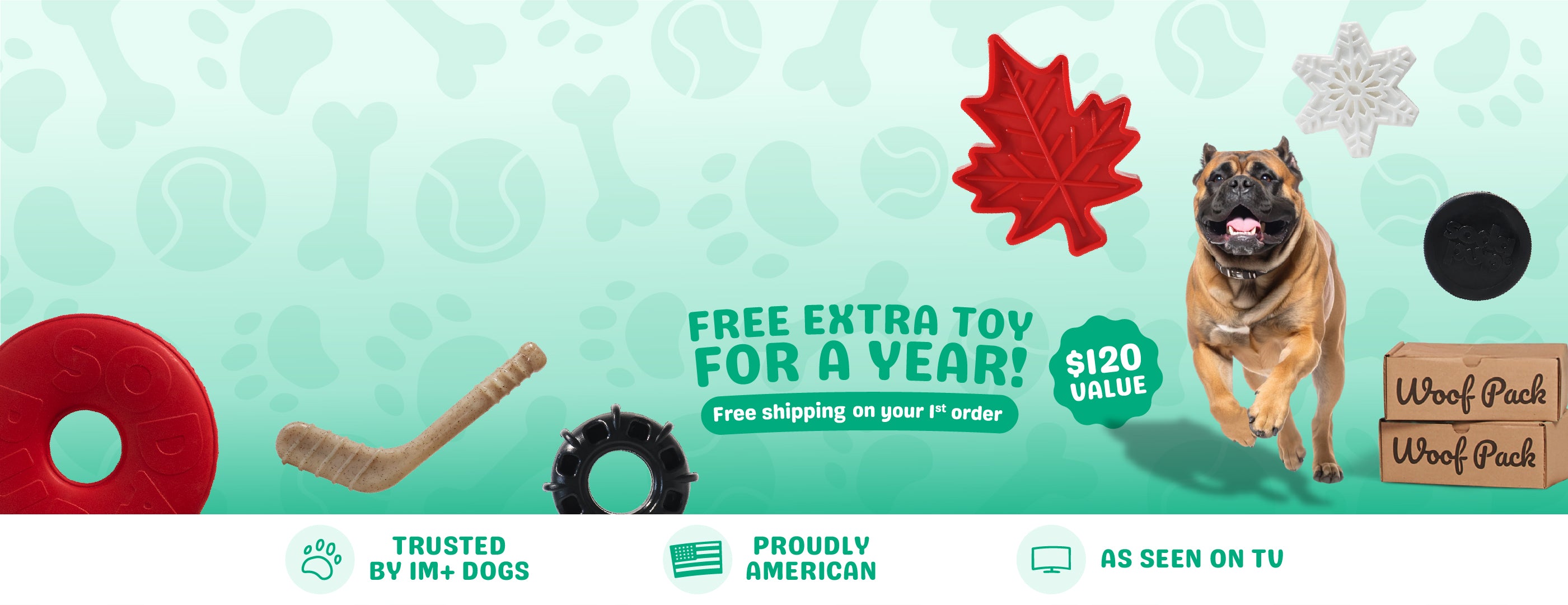 Each Woof Pack pack includes 4–5 items: 2 durable toys and 2 bags of all-natural dog treats valued at $60+.