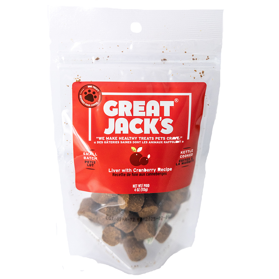 Reward your good boy with a treat he can’t refuse! Great Jack’s Soft and Chewy Liver Recipe Dog Treats are made in Canada with 60% pork liver and have a protein content of over 25%! Not only are they high in protein and low in fat, paw-fect for training, but they are also kettle cooked with fresh ingredients and are 100% free of grains. Canine companions of all breeds, sizes and ages can enjoy these soft, scrumptious, palatable treats.